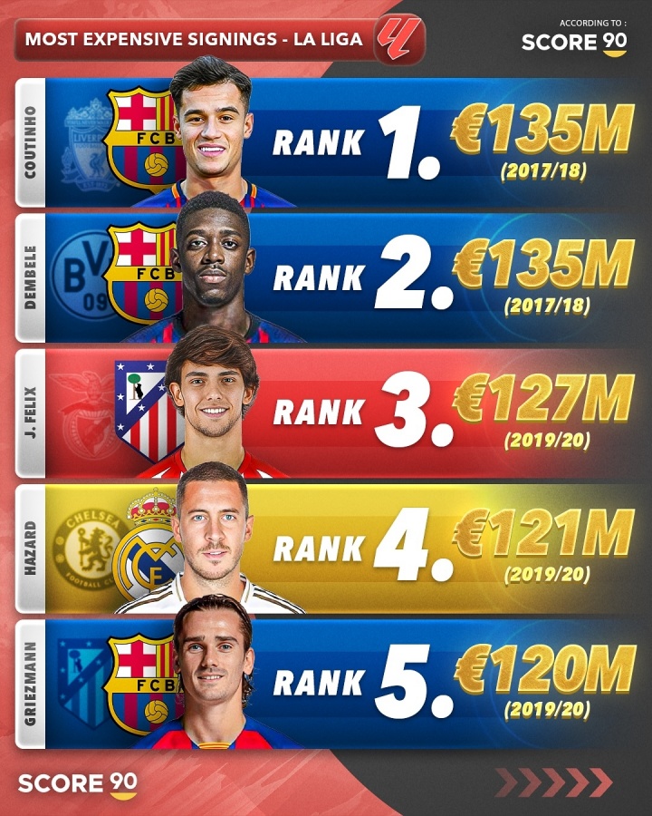 08月07日讯 外媒SCORE90列出了西甲历史上引援最贵的前五名排行,库蒂尼奥和登贝莱以1.35亿欧元的转会费并列第一。
